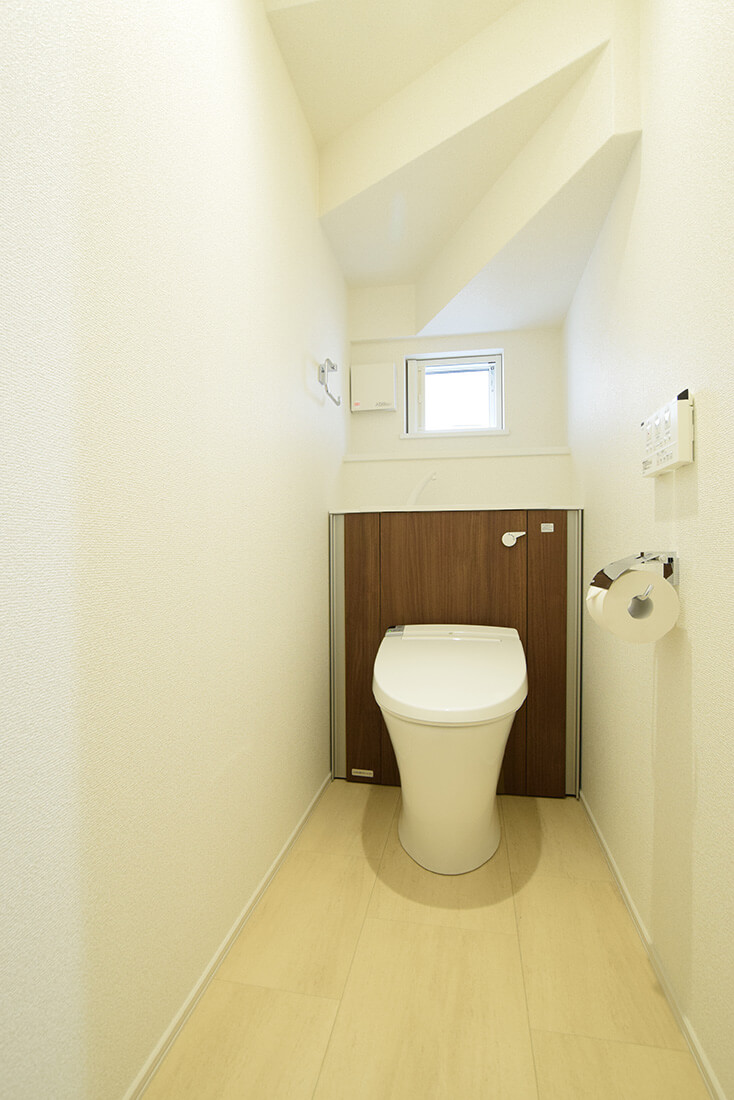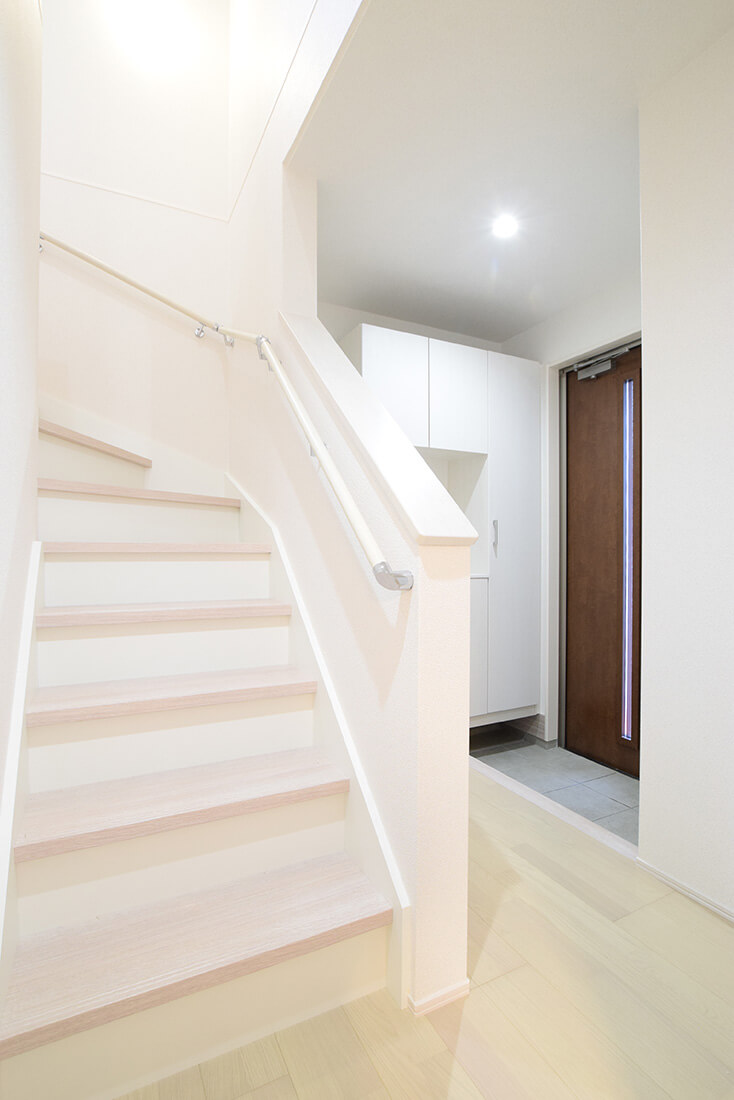 真っ白な外壁にブラウンの玄関ドアがおしゃれな外観。
